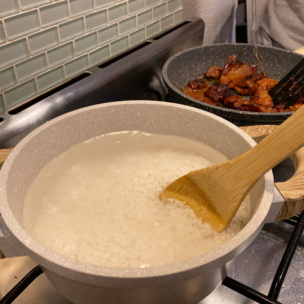 The first item of food she cooks is white rice, a common staple with every meal. For most Filipinos, rice is life, it is livelihood and sustenance. When cooking rice it is important to clean it by rinsing it a few times before placing it in a trusty rice cooker (however, rice cookers are expensive so she improvised and cooked rice in a pot on the stove). Some Filipinos say that they never feel full unless rice is served with a dish.